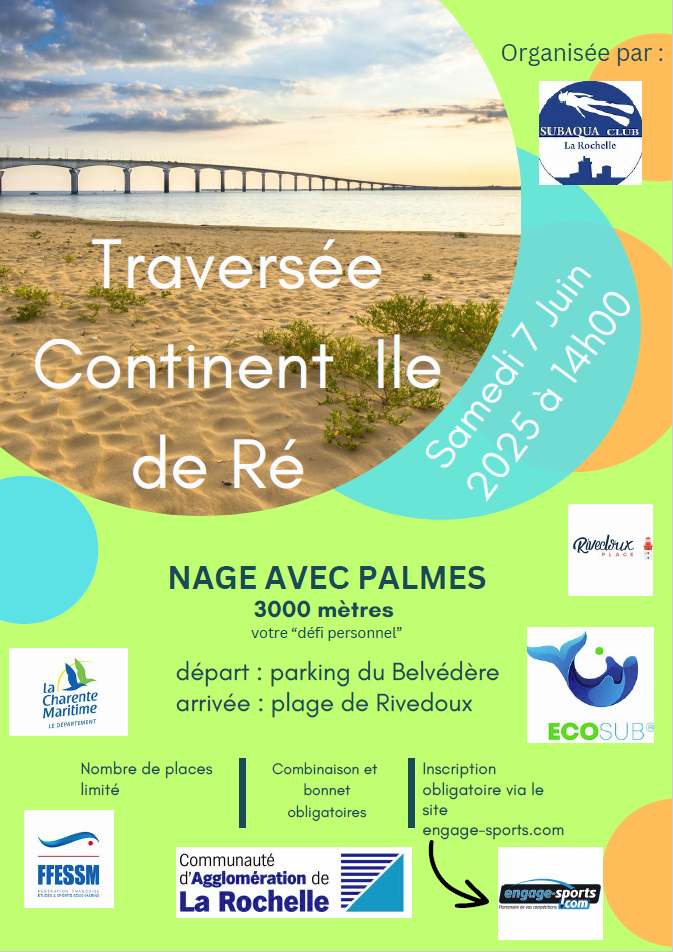 En 2026, aura lieu la 56ème Traversée Continent – Ile de Ré le 23 mai. Cette compétition de nage avec palmes a lieu tous les ans (à de rares exceptions) et part de la plage de La Repentie (parking du Belvédère) pour arriver sur la plage de Rivedoux, après 3 kilomètres de nage en mer. Cette compétition, unique en son genre sur la façade atlantique, se déroule le long du pont de l’ile de Ré en restant constamment au sud de celui-ci. Cette année, elle partira à 10h45